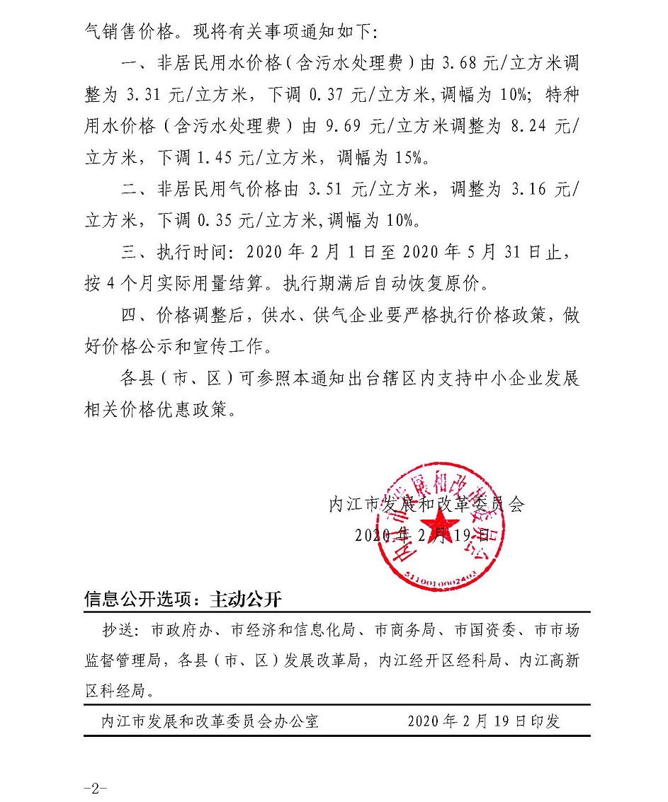 內江市發展和改革委員會關于應對新冠肺炎疫情緩解中小企業生產經營困難臨時調整非居民用水、用氣銷售價格的通知
